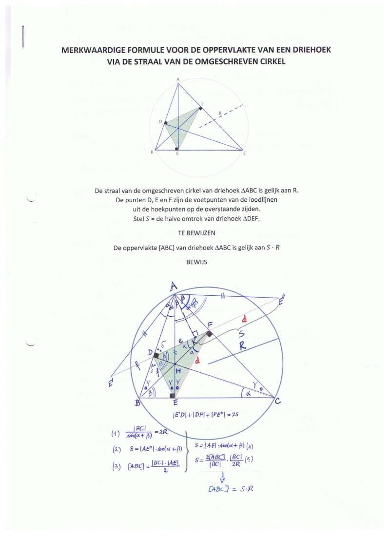 Hieronder publiceren we een analoge formule voor de oppervlakte van een driehoek, maar nu met de straal van de omgeschreven cirkel.