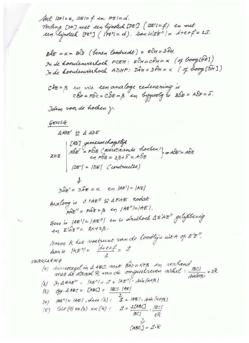 Voor een driehoek waarvan de halve omtrek s is en waarvan de straal van de ingeschreven cirkel r is , is de oppervlakte gelijk aan rs. Men bewijst dit eenvoudig door de driehoek op te delen in drie driehoeken door het middelpunt van de ingeschreven cirkel te verbinden met de drie hoekpunten. De hoogte van de drie driehoeken is dan gelijk is aan r.